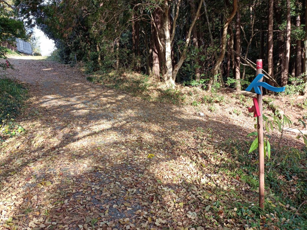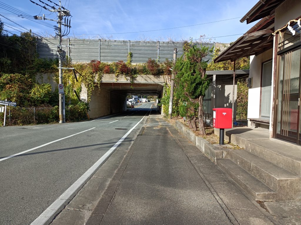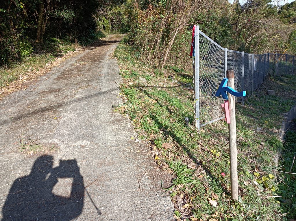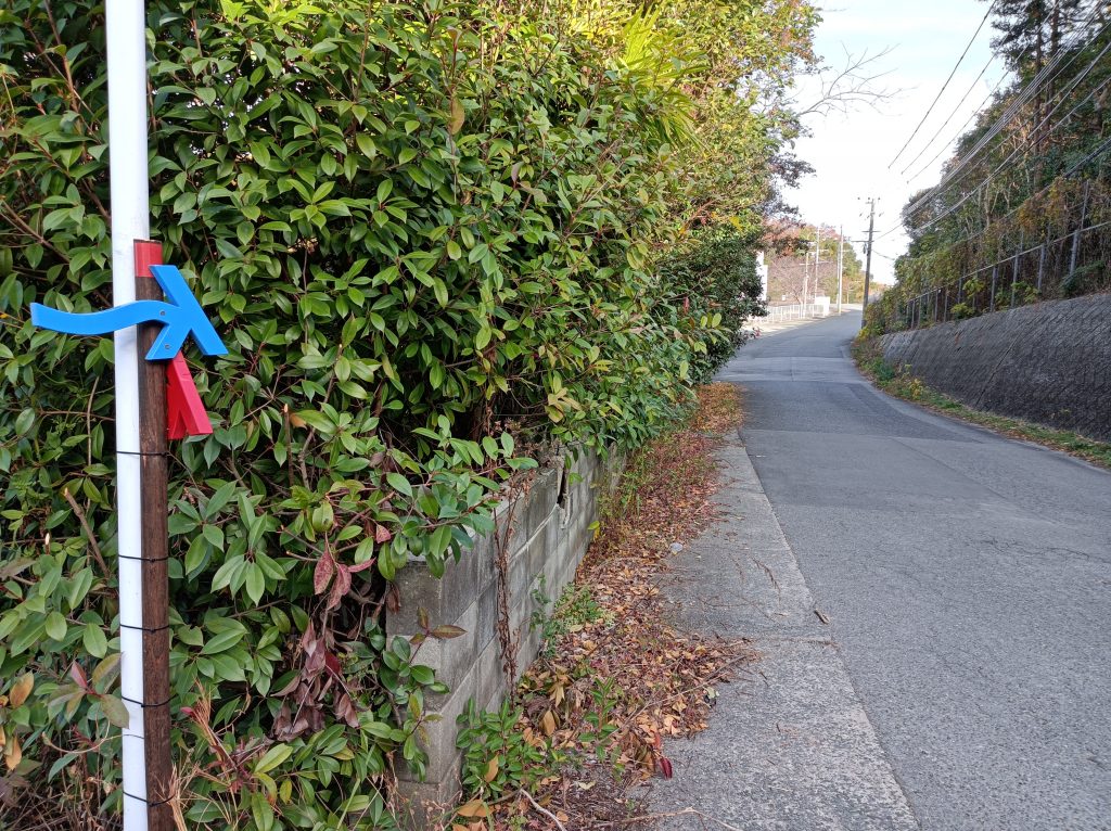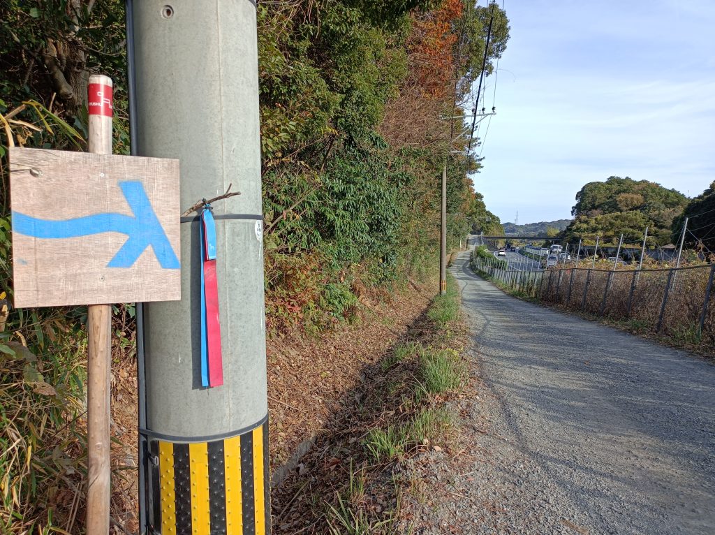 西鉄新宮駅からコミュニティバス「マリンクス」のさんらいず線に乗り、揺られる事40分弱で、目的の場所「佐屋バス亭」に到着します。バスを降りると、停留所横に九州オルレの看板が掲げられています。地図を頼りに歩いていくと、所々に九州オルレの目印が記されているので、その通りに歩いて行けば、迷うことなく目的の場所へと行けるみたいです。九州自動車道の高架下を潜り抜けると、右へと曲がり、九州自動車道と平行に歩いていきます。途中、右側に歩道橋がありますが、渡らずにまっすぐ先へと進みます。