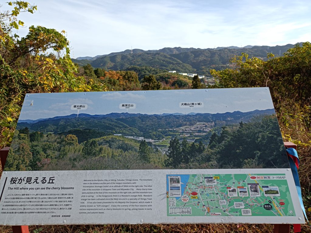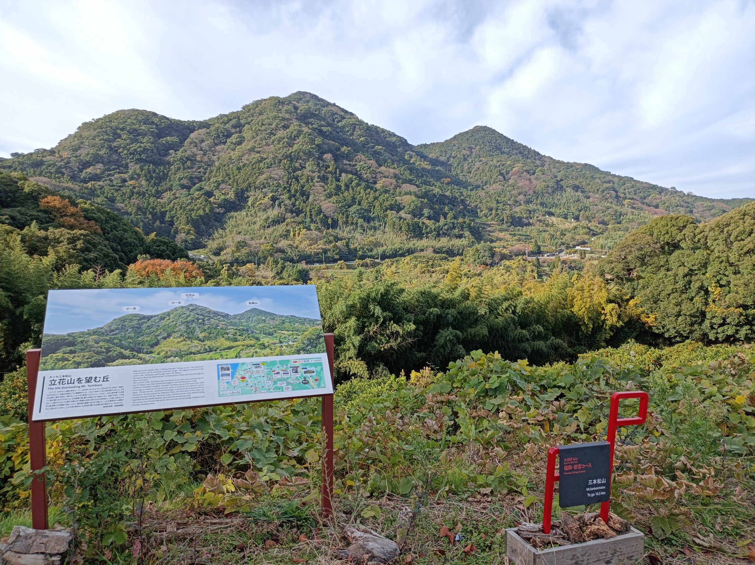 途中、藪の中へと入るところに、九州オルレの目印が掲げられているので、そのまま藪の中へと突き進んで行きます。迷子になりそうですが、目印を頼りに歩いて行けば、いつのまにか「桜が見える丘」、「立花山を望む丘」の看板を目にし、颯爽とそびえる立花山を目にすることができます。