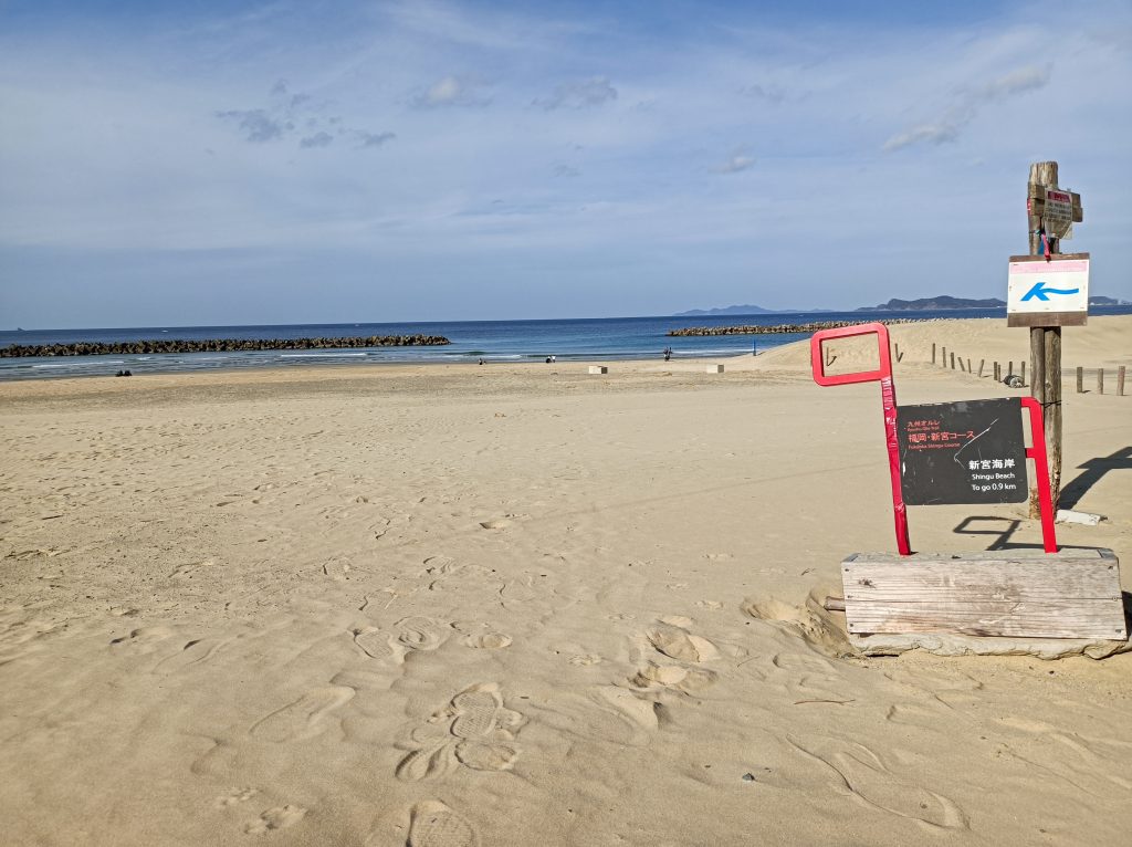 新宮中央駅の向こう側の階段を降り、新宮町役場を目印に進んで行くと、松林が見えてくるので、そのまま松林の中へと入って行くと、ここが「楯の松原」です。どこも松林に囲まれているので、迷子になりそうですが、目印を頼りに、奥へと進んで行くと、開けた場所にたどり着けます。ここは「新宮海岸」で、爽やかな海の香りが心地よいです。残りゴールは間近、新宮神社の鳥居を横目に松林を抜けていくと最終ゴール「西鉄新宮駅」が見えてきました。長い長い九州オルレ、福岡新宮コースの旅も終わってみれば、あっという間に疲れも吹き飛んでしまいます。